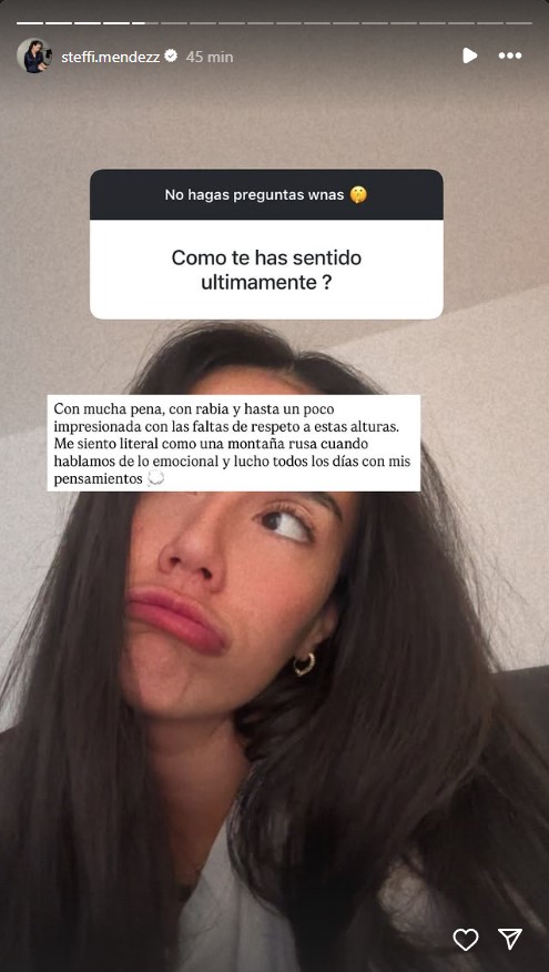 De lo anterior ya ha pasado un tiempo y en esa línea, un seguidor le preguntó a Steffi Méndez cómo se ha sentido últimamente: "Con mucha pena, con rabia".