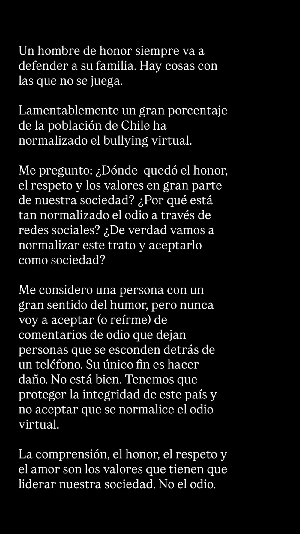 “Hay cosas con las que no se juega. Lamentablemente, un gran porcentaje de la población de Chile ha normalizado el bullying virtual”, agregó.