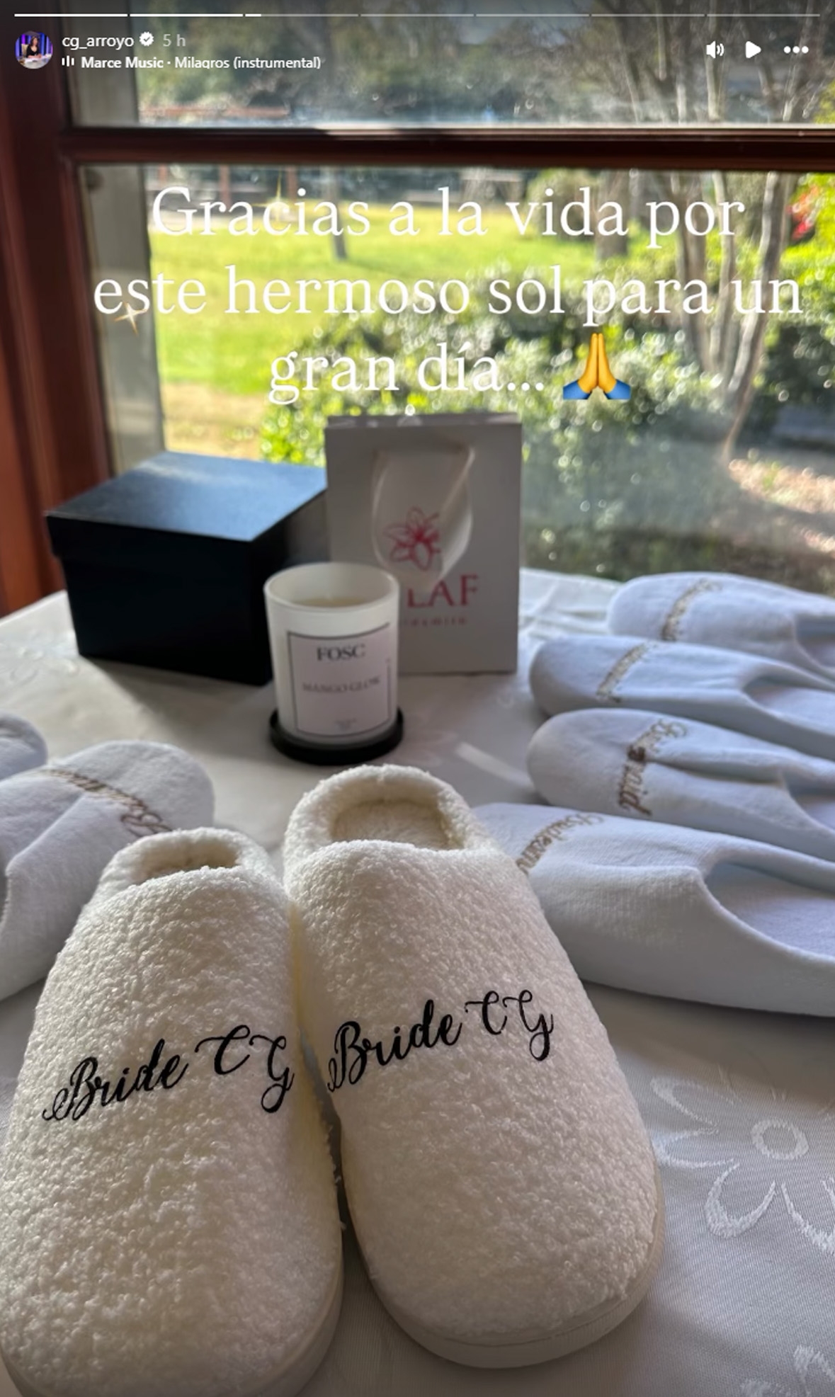 En la antesala del esperado evento, la abogada compartió en sus redes sociales algunos detalles de la preparación. A través de sus historias de Instagram, mostró una fotografía de unas pantuflas blancas con la inscripción en inglés "Novia CG", apoyadas en el borde de una ventana con vista a un campo.