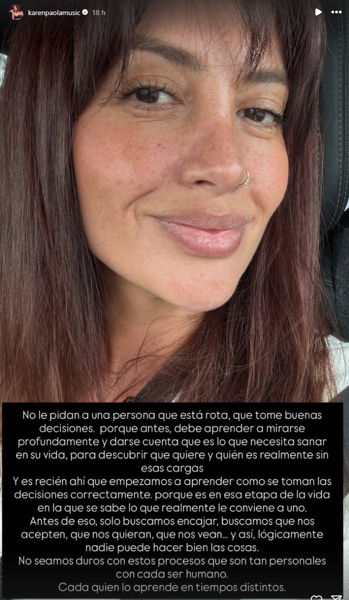 Karen Paola sorprendió a sus seguidores al compartir una profunda reflexión a través de su cuenta de Instagram. En el mensaje, la cantante lanzó una dura crítica hacia quienes juzgan sin conocer los procesos personales que vive cada persona.