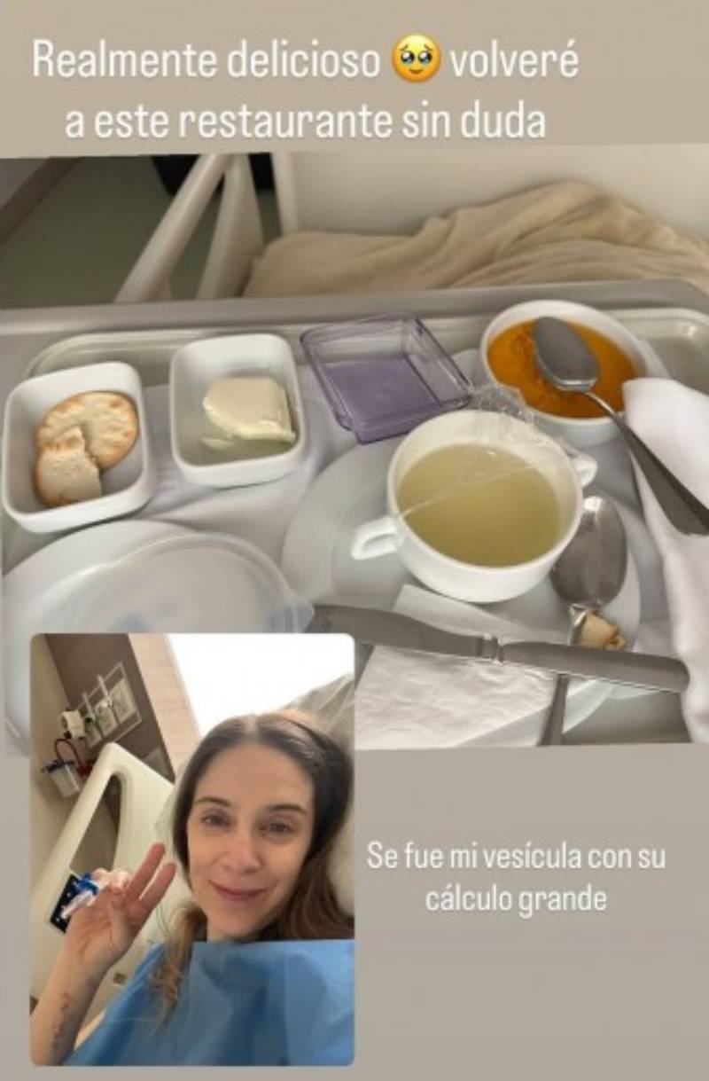 Según una historia que subió Alison a su Instagram este lunes, le extrajeron la vesícula con un cálculo muy grande. La imagen era una composición de dos fotografías, en una saluda a la cámara con sus dedos y en la otra, muestra un almuerzo liviano que le dieron en el centro hospitalario donde se operó.
