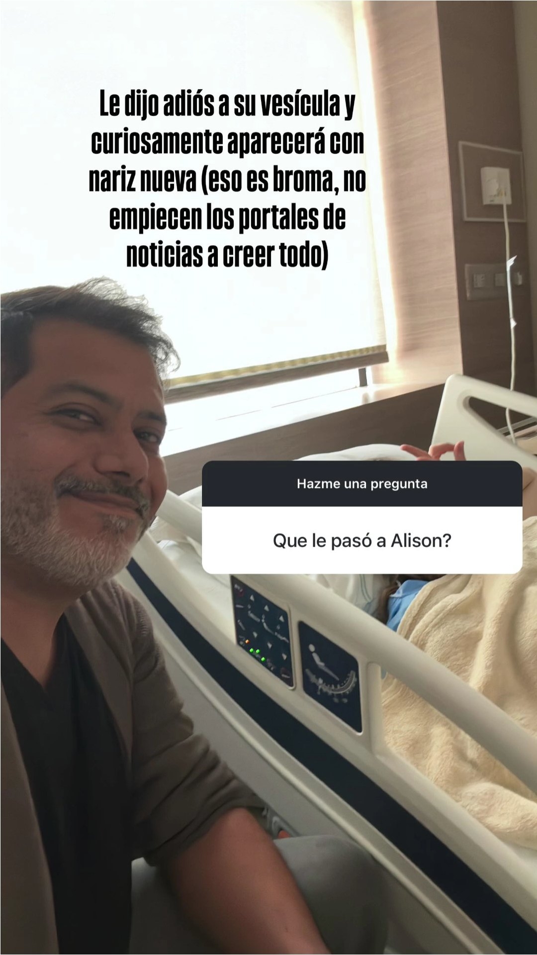 En la foto aparece Mandel acostada en la cama del hospital, y su esposo sentado a su lado. Alison “le dijo adiós a su vesícula y curiosamente aparecerá con nariz nueva. (Eso es broma)”, agregó, con su característico humor.