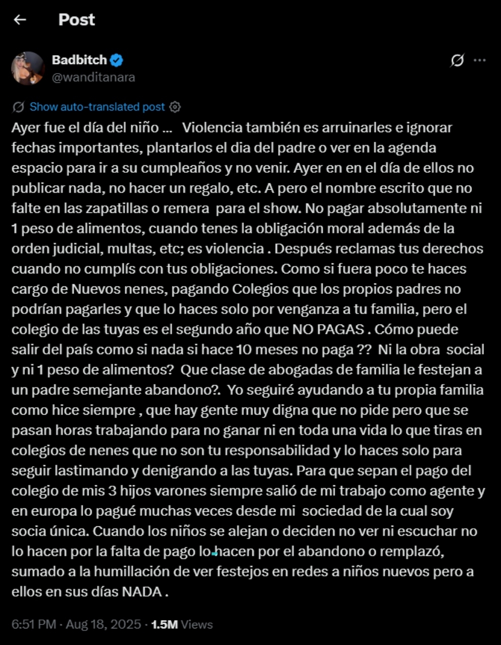 Terminó el post con un dato de la relación de sus hijos con el futbolista: “Cuando los niños se alejan o deciden no ver ni escuchar, no lo hacen por la falta de pago, lo hacen por el abandono o reemplazo, sumado a la humillación de ver festejos en redes a niños nuevos, pero a ellos en sus días: nada”.
