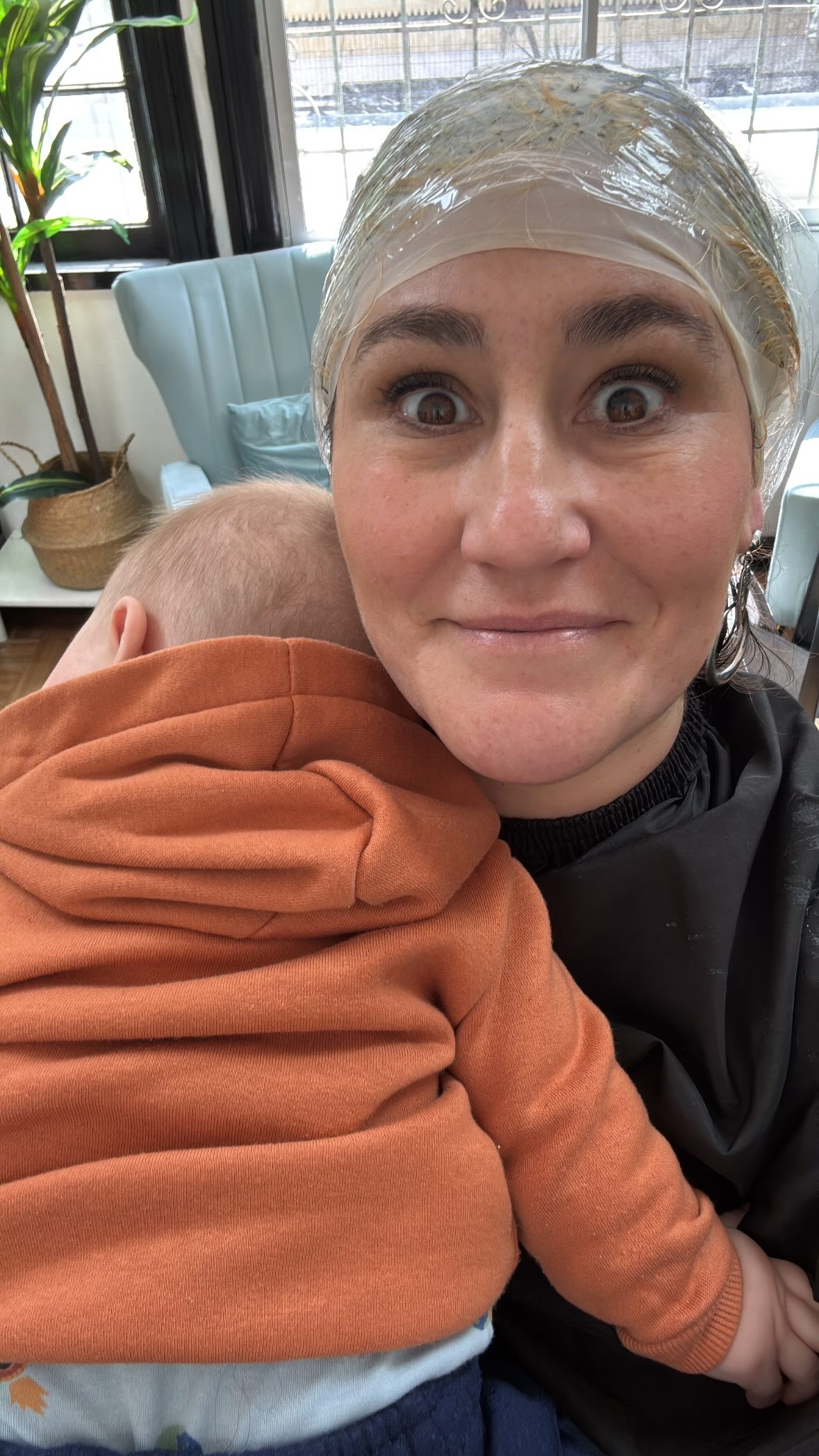 Luego, Belenaza mostró parte del proceso del cambio de color de su cabello, mientras tenía a su pequeño en brazos y su cabeza estaba cubierta para que el teñido hiciera efecto.