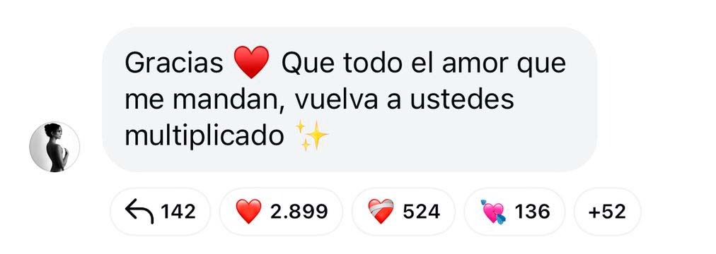 "Gracias. Que todo el amor que me mandan, vuelva a ustedes multiplicado", escribió la influencer y creadora de contenido, a través de su canal de difusión en Instagram.