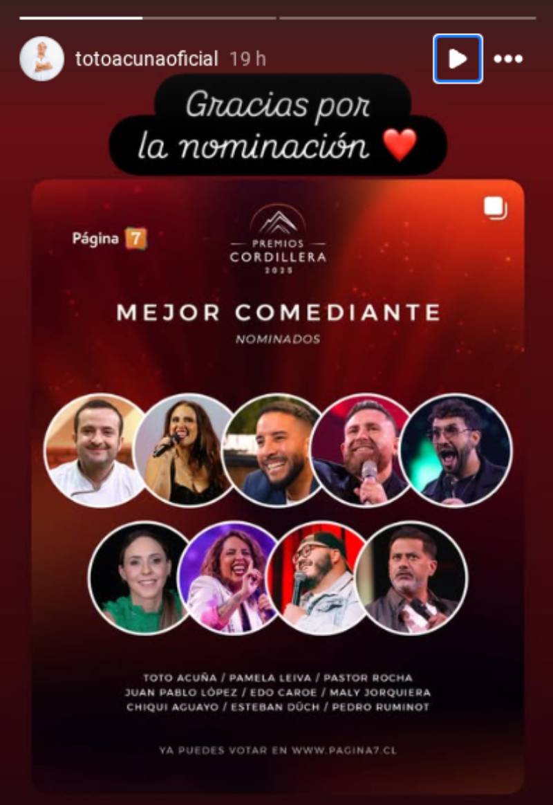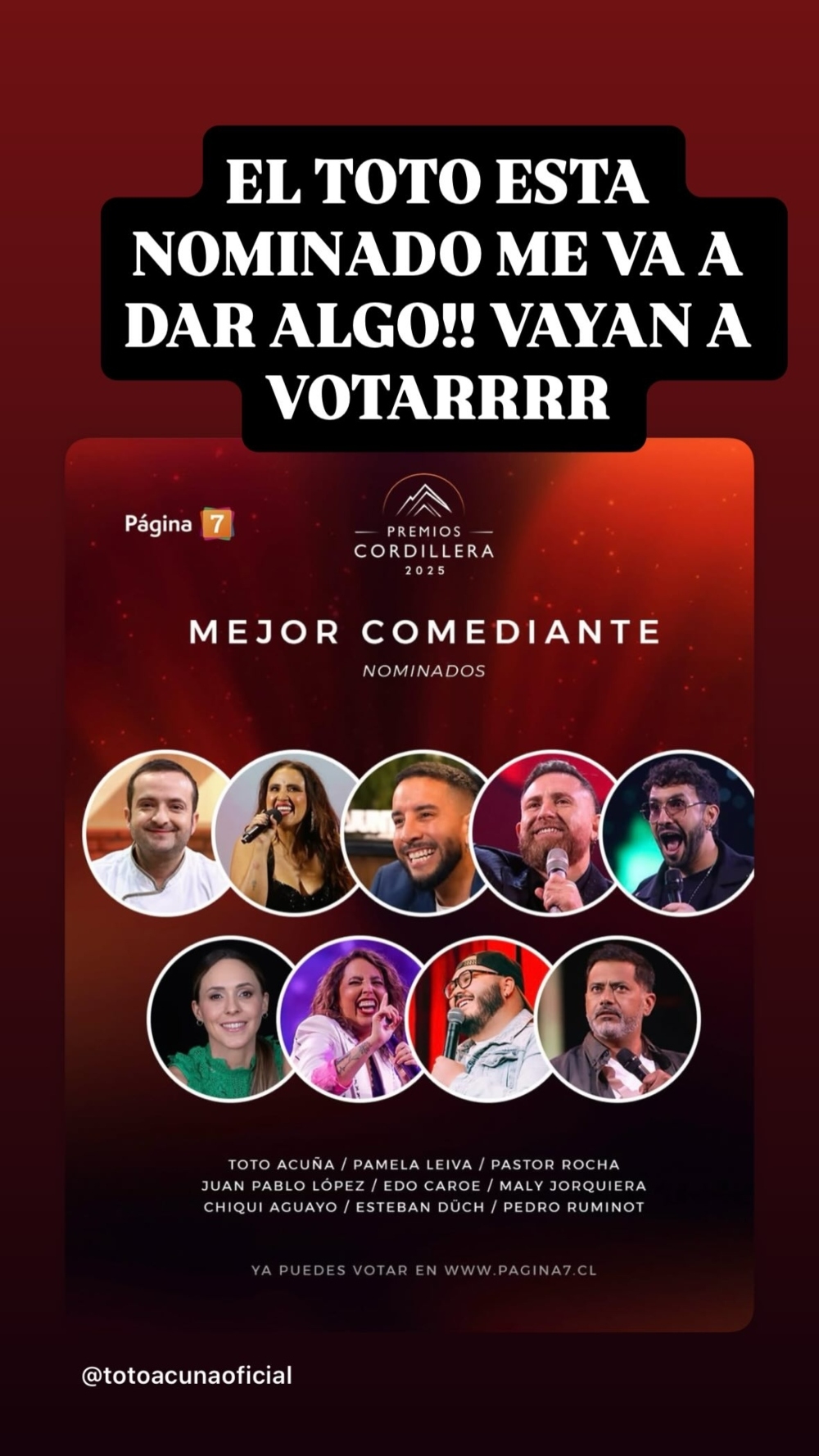 Evidentemente orgullosa y emocionada, Belén reaccionó de inmediato en apoyo a su marido y colega. “El Toto está nominado, me va a dar algo. Vayan a votar”, escribió en una historia de Instagram. En ella, reposteó la publicación que muestra los nominados del Premio Cordillera 2025 a Mejor Comediante.