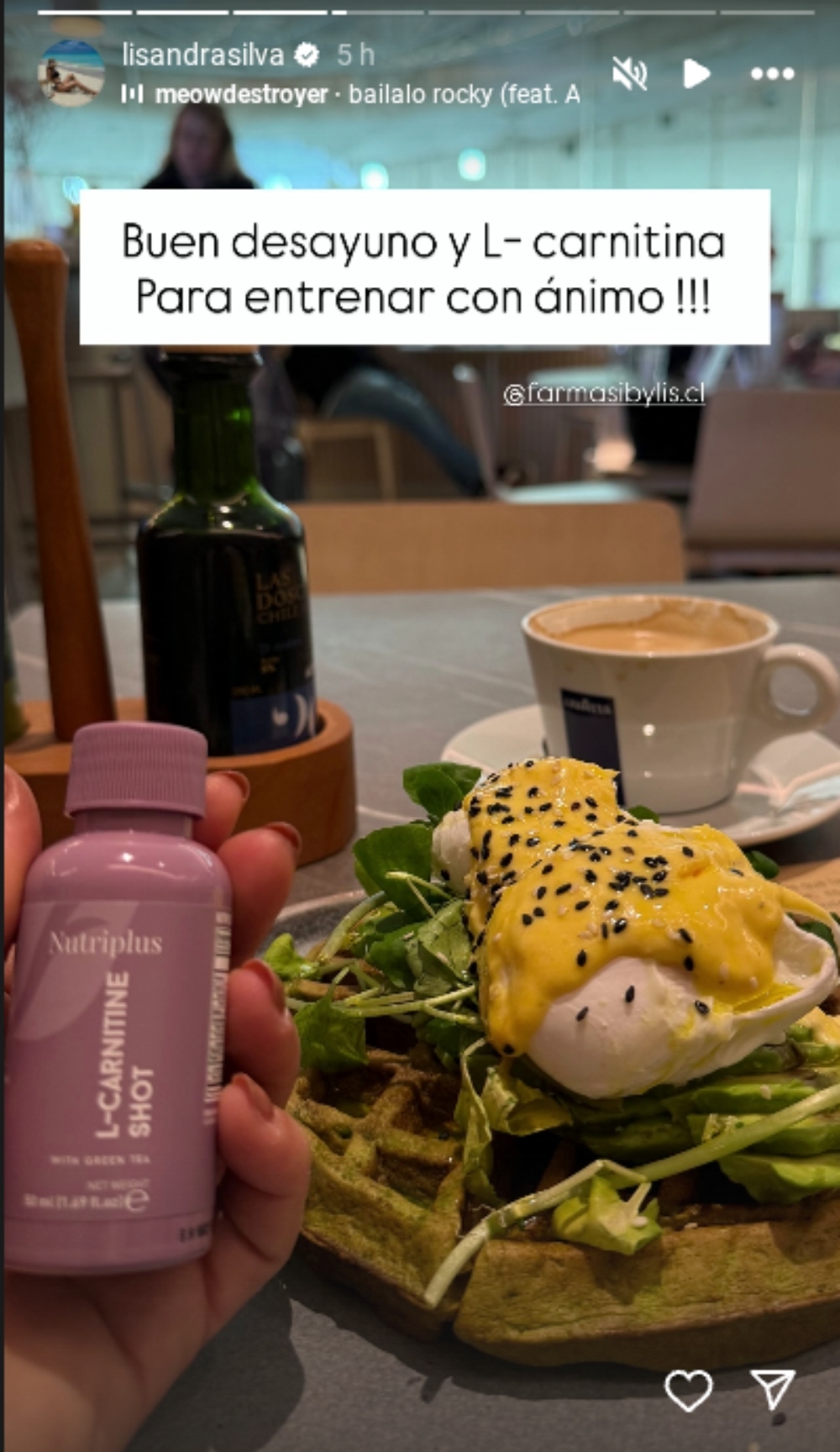 “Buen desayuno y L-Carnitina para entrenar con ánimo”, reveló Lisandra en una historia de Instagram. En la foto que publicó, muestra el envase del suplemento líquido y su comida de la mañana.