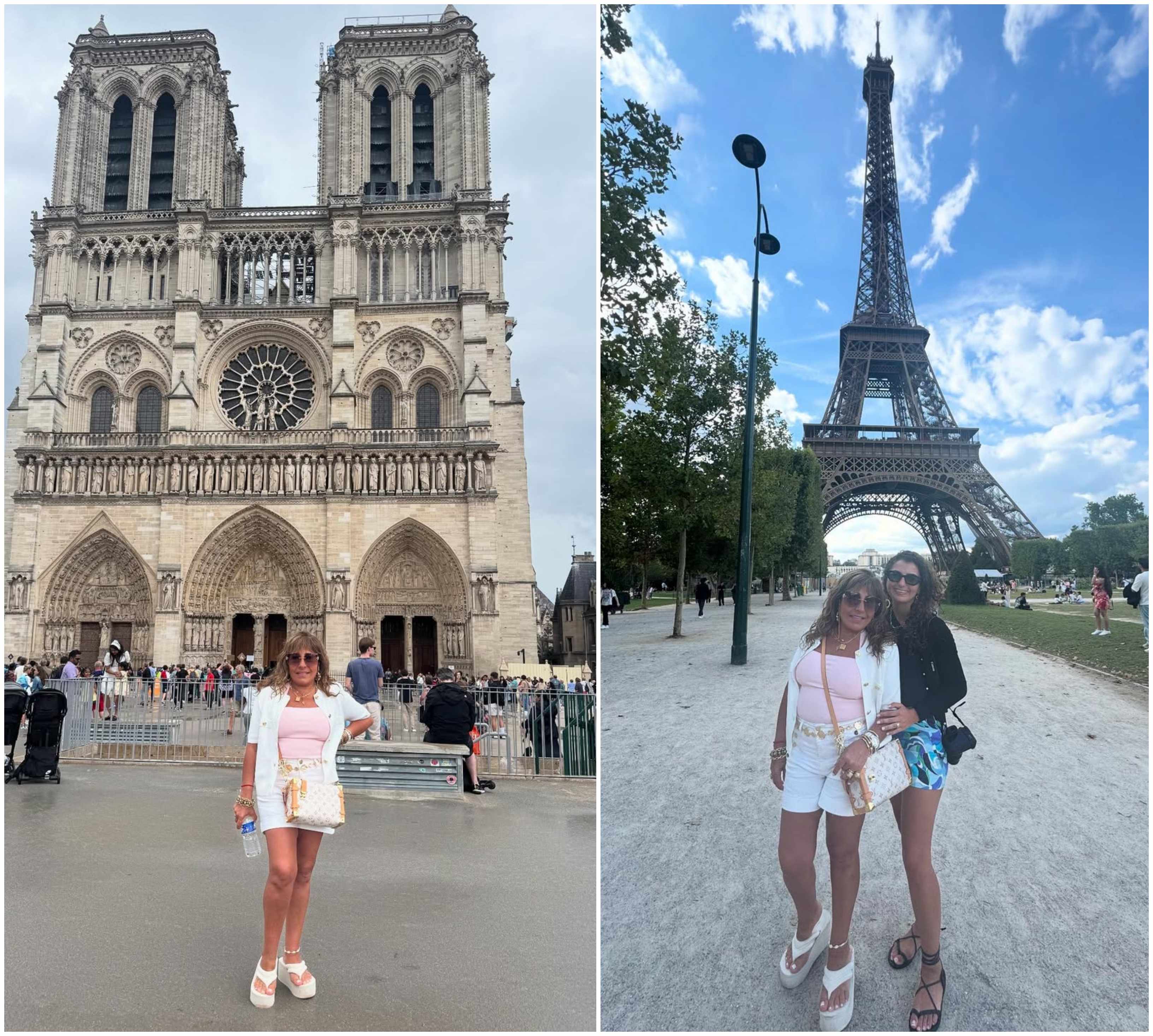 En sus postales, la abogada posa feliz frente al Notre Dame vestida con un conjunto de short blanco, una polera rosa pastel, sandalias altas, una cartera de diseñador y joyería dorada.