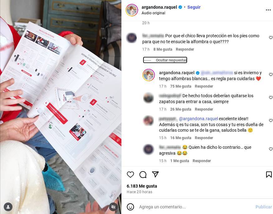 "¿Por qué el chico lleva protección en los pies? ¿Cómo para que no te ensucie la alfombra o qué?", cuestionó un usuario. Raquel no dudó en revelar que esta es una regla de oro para los visitantes.