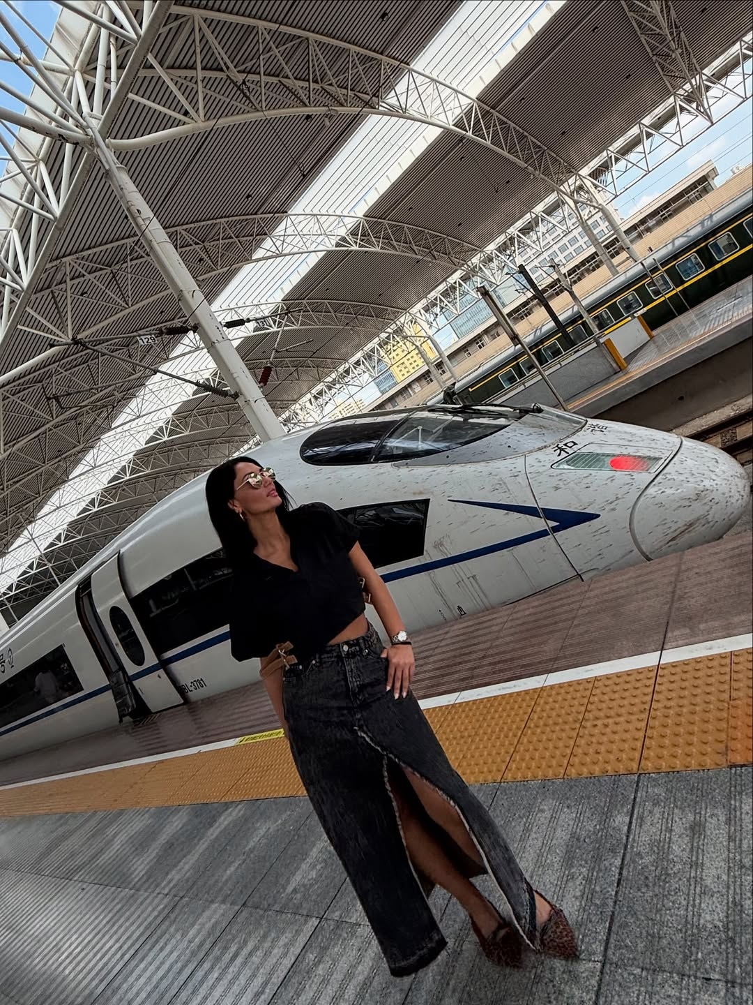 La pronunciada abertura asimétrica al frente le dio un toque especial que Pamela Díaz supo aprovechar al posar con el tren bala de Shanghái, uno de los más rápidos del mundo con su tecnología de levitación magnética.