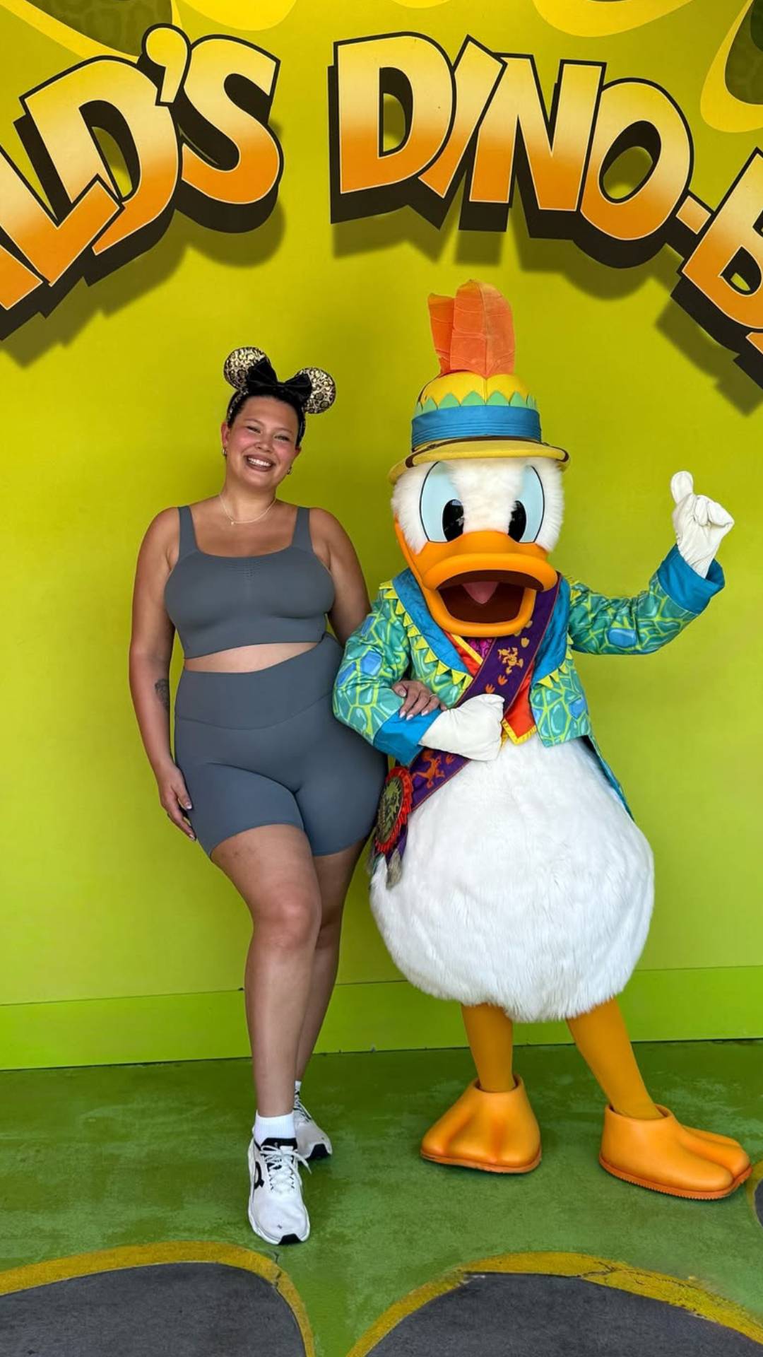 La influencer posó con el Pato Donald, icónico personaje de Disney, y además, mostró los diversos tonos de verdes que existen en la naturaleza del parque temático.