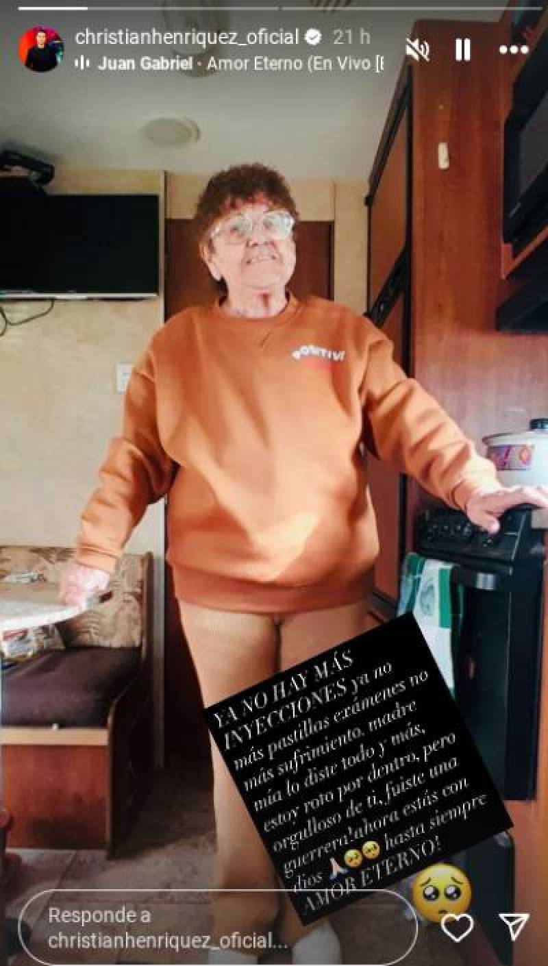 "Ruperto" publicó en sus historias una postal de su madre sonriente en un momento cotidiano, sobre la que escribió una despedida. "Ya no hay más inyecciones, ya no más pastillas, no más sufrimiento, madre mía", dijo.