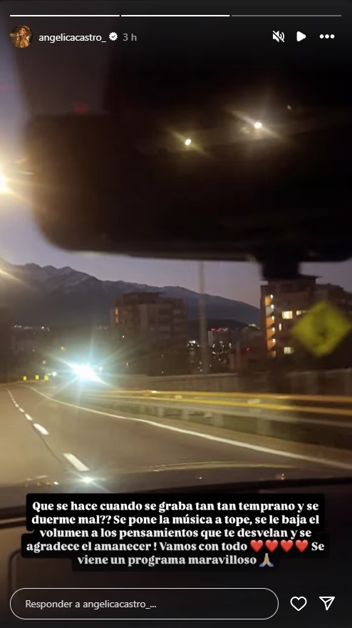 "¿Qué se hace cuando se graba tan temprano y se duerme mal? Se pone la música a tope, se le baja el volumen a los pensamientos que te desvelan y se agradece el amanecer. Vamos con todo, se viene un programa maravilloso", escribió Angélica Castro.