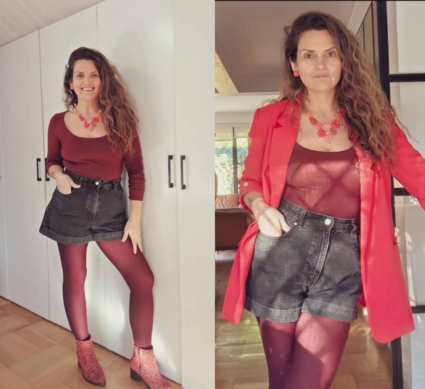 En su primer look, Connie Achurra combina un short negro de mezclilla con pantys rojas y una polera burdeos, junto a un blazer rojo vibrante y botas de tacón con estampado de animal print, también en tonos rojizos.