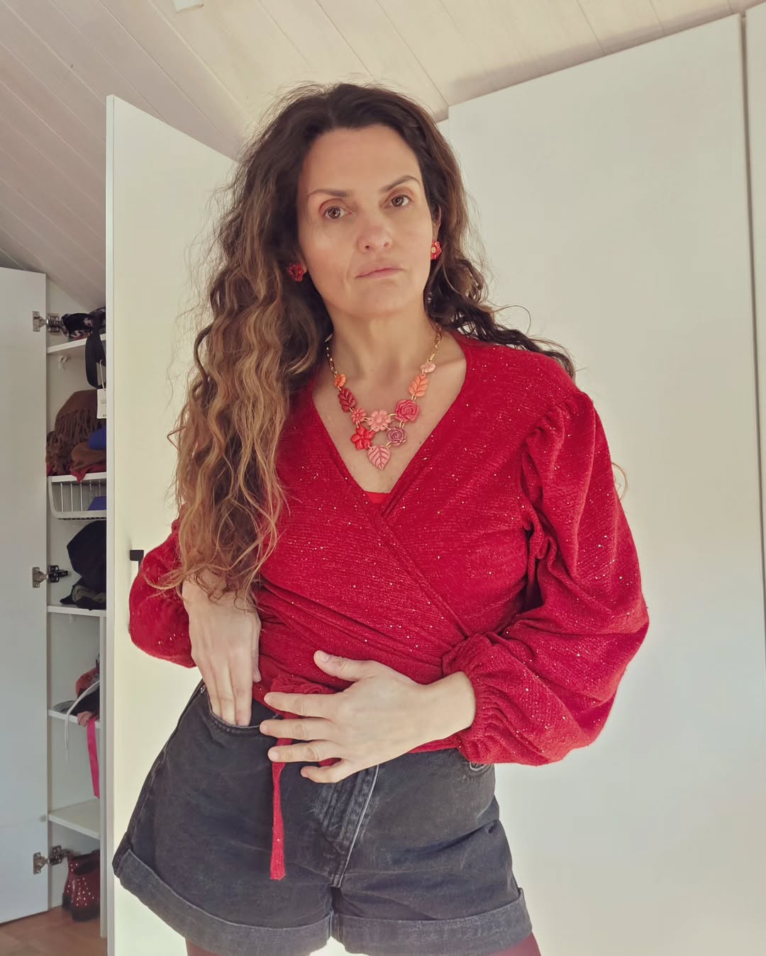 Otra propuesta parte de la misma base de shorts y pantys, pero esta vez luce arriba una blusa roja cruzada de mangas largas y abullonadas, acompañada con sutiles destellos.