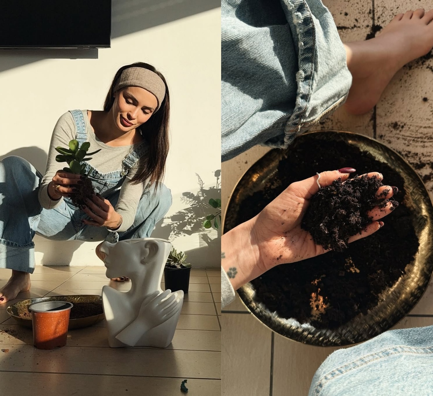 En su publicación, Constanza Capelli reveló que no teme ensuciarse las manos. En varias fotos, mostró su proceso para preparar la tierra e instalar la planta en una moderna maceta en forma de rostro femenino.