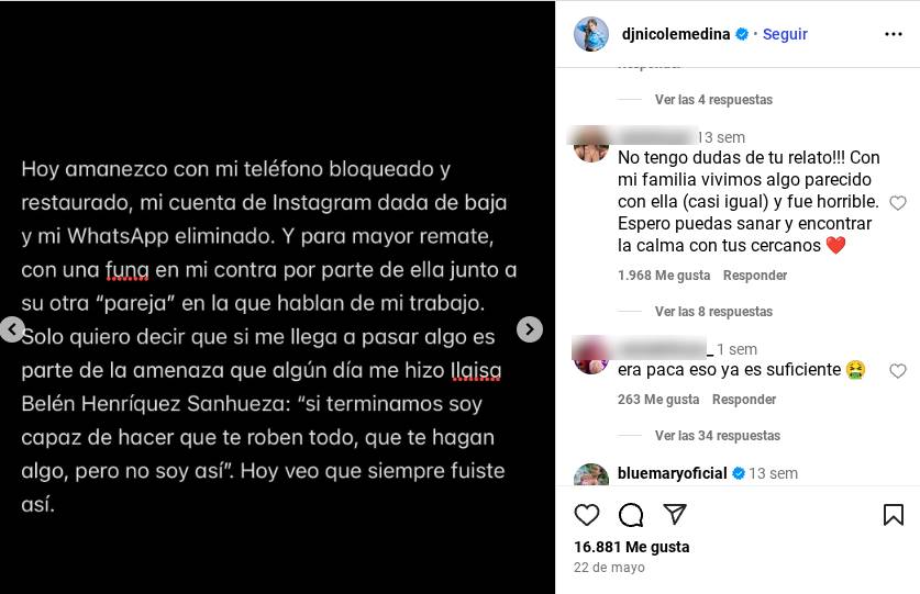 Con lo anterior, la excarabinera parece hacer referencia a las declaraciones de su expolola Nicole Medina, otra DJ quien afirmó en un show de farándula que Ilaisa suele engatusar a los hombres y que Karol Lucero no es el único con quien estuvo saliendo.