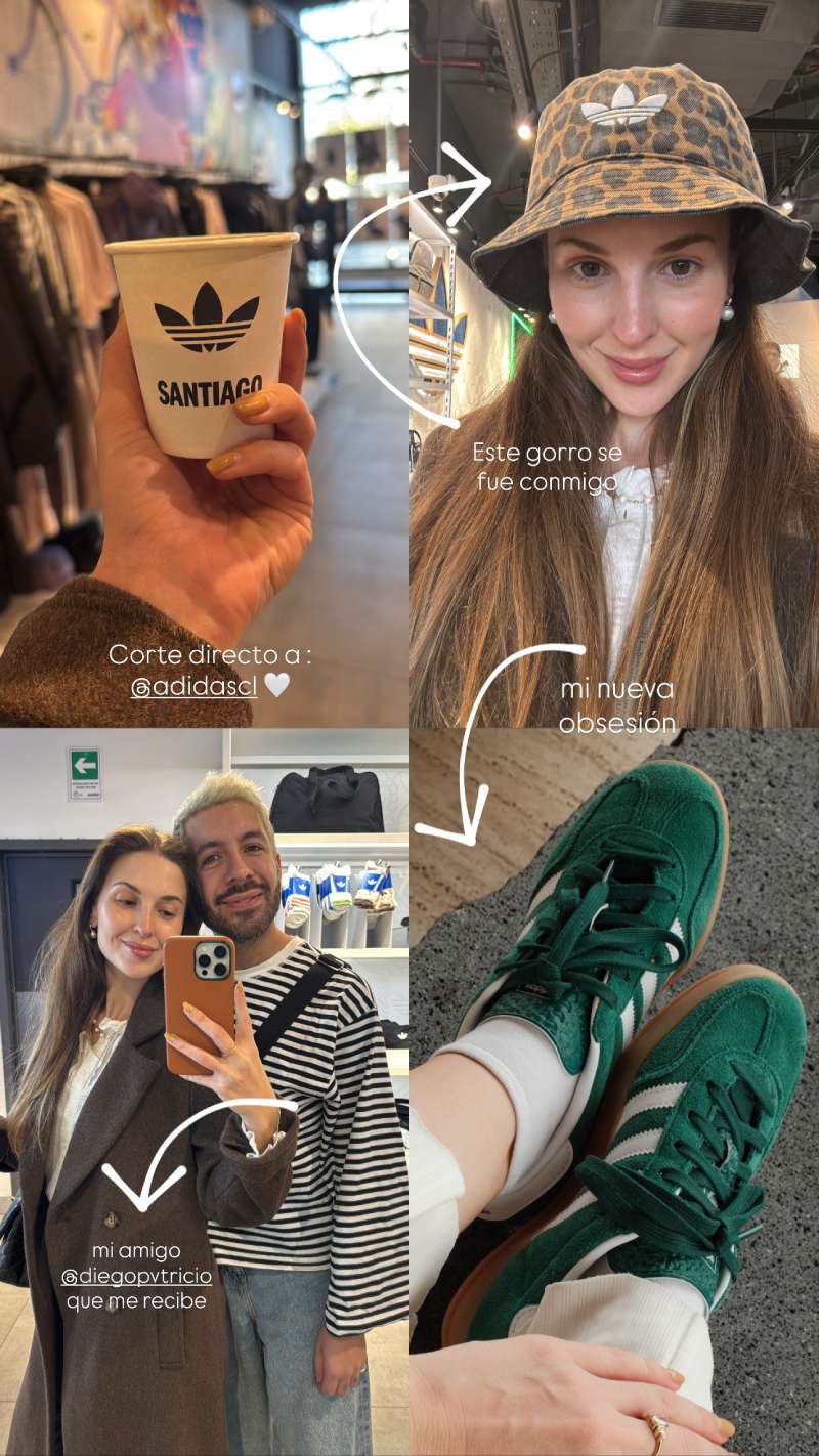 También brindó un pequeño adelanto de sus primeras horas en Santiago con fotos variadas: un café, el recibimiento de su amigo Diego Patricio, un gorro de animal print y unas zapatillas color verde.