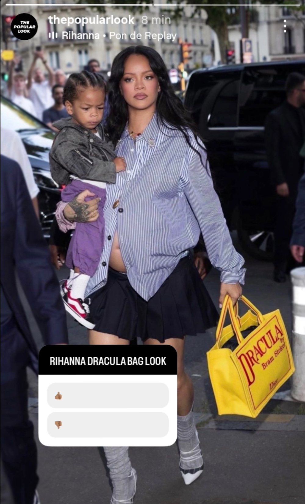 La postal de la artista apareció en el Instagram de The Popular Look, el medio fashionista que en sus historias la mostró cargando a su hija Riot con una mano y en la otra el bolso. Se nota su pancita de embarazo, que traerá al mundo a su tercer hijo con A$AP Rocky.