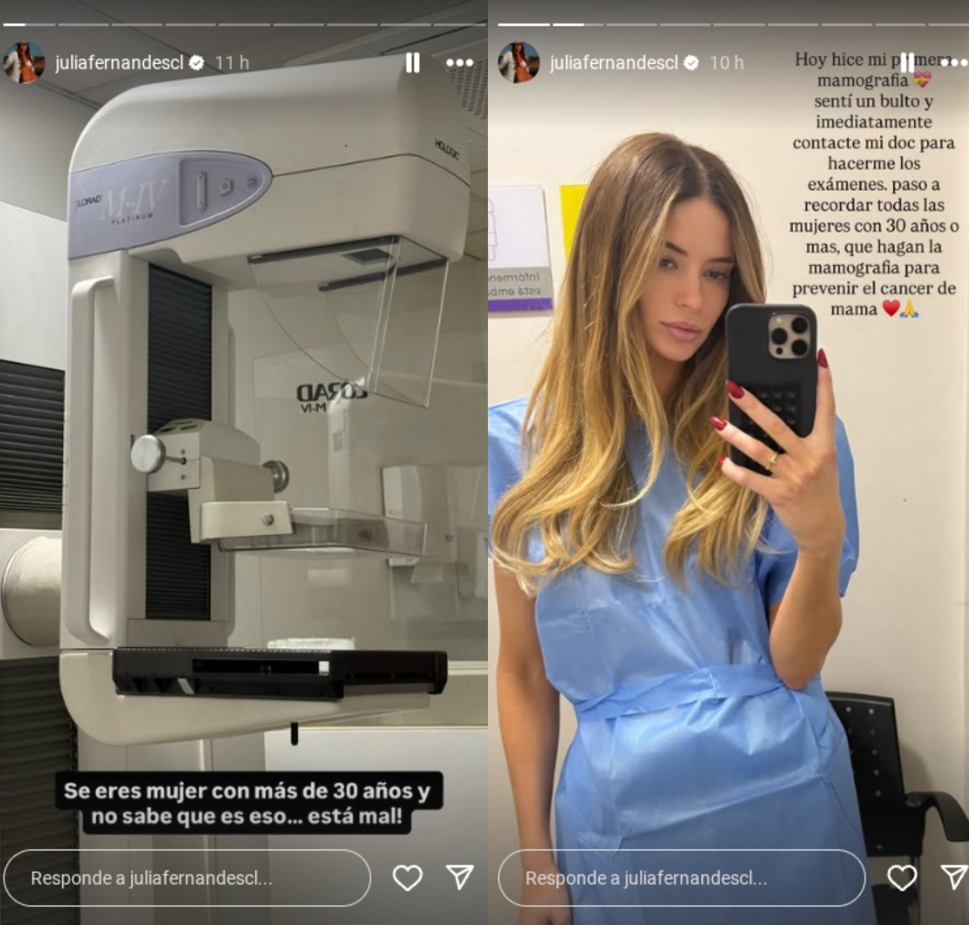 Julia Fernandes señaló en su video que se encuentra muy sensible luego de hacerse una mamografía por un bulto en un seno. “El examen queda listo en cinco días”, agregó, para luego invitar a sus fans mayores de 30 años a realizarse estos estudios de rutina.