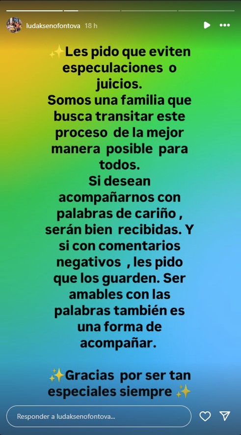 "Les pido que eviten especulaciones o juicios. Somos una familia que busca transitar este proceso de la mejor manera posible para todos. Si desean acompañarnos con palabras de cariño, serán bien recibidas. Y si son comentarios negativos, les pido que los guarden. Ser amables con las palabras también es una forma de acompañar", cerró.