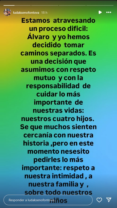 "Estamos atravesando un proceso difícil. Álvaro y yo decidimos tomar caminos separados. Es una decisión que asumimos con respeto mutuo y con la responsabilidad de cuidar lo más importante de nuestras vidas: nuestros cuatro hijos", comenzó escribiendo la mujer.