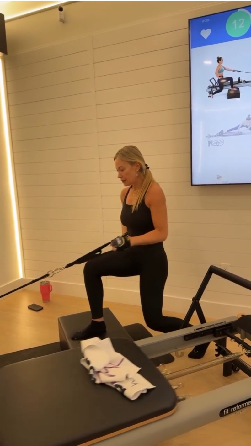 En otro momento, se muestra a la presentadora de TV practicando reformer de pilates con una banda elástica.
