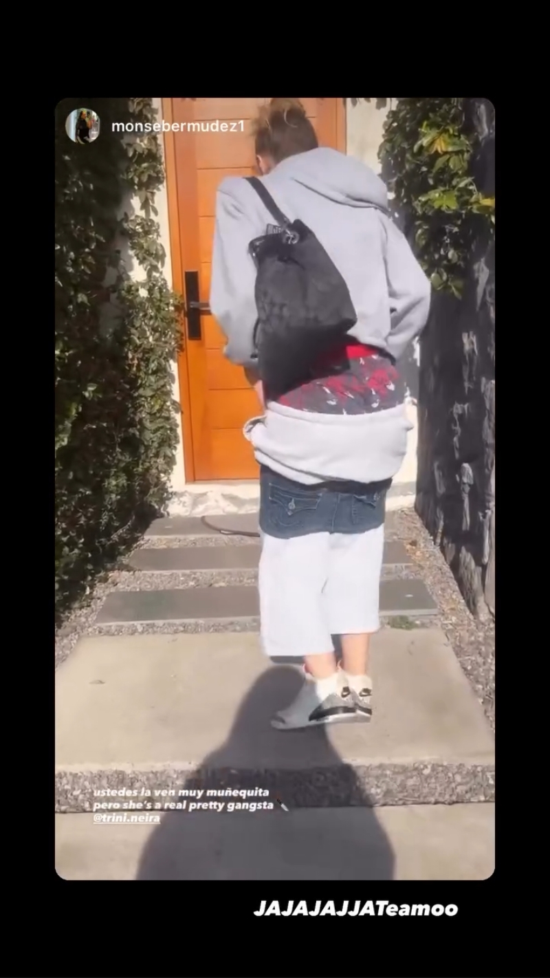 En sus historias de Instagram, la influencer reposteó el video de su amiga Monse Bermúdez, donde se la ve saltando escalones arriba y simulando algunos pasos de baile antes de abrir la puerta de una casa.