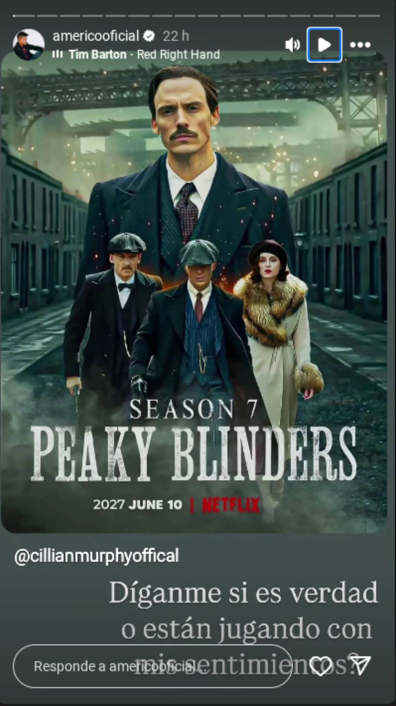 "Díganme si es verdad, o si están jugando con mis sentimientos", escribió el intérprete en sus historias de Instagram, al repostear un afiche que circula en las redes de la supuesta séptima temporada de la famosa serie "Peaky Blinders".