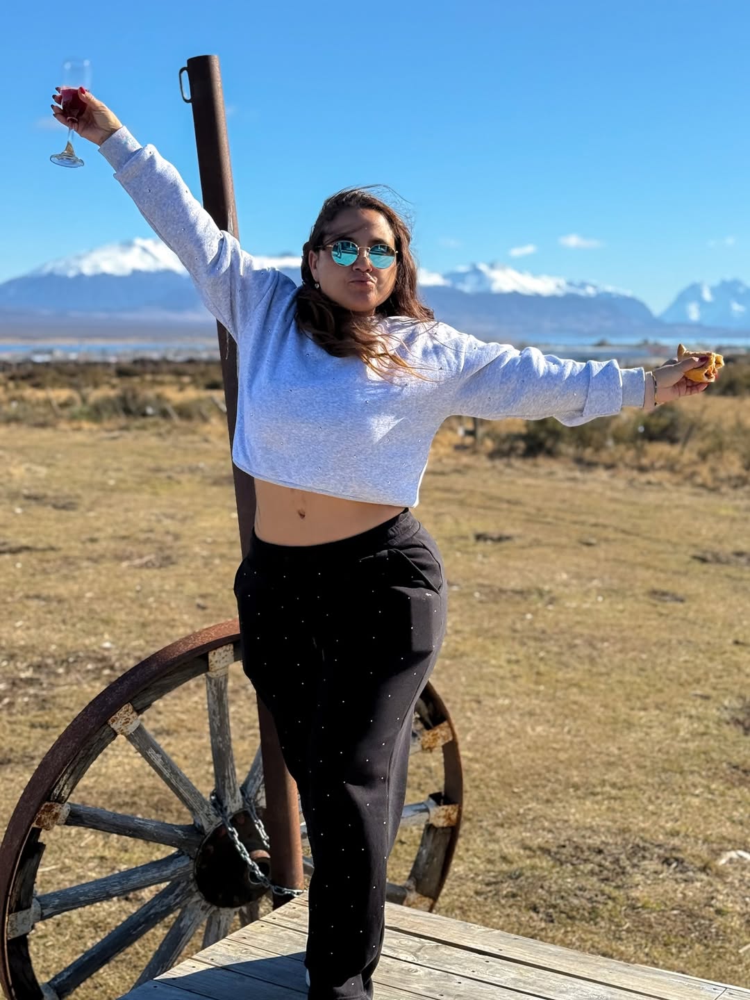 Desde Puerto Natales, Pamela Leiva posó en medio de la naturaleza con una vista de montañas nevadas y luciendo un conjunto de dos piezas en el que destacó su buzo de color negro.