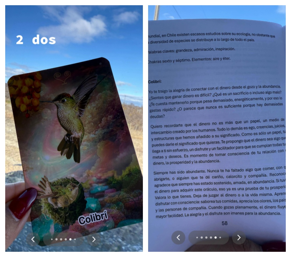“Quiero recordarte que el dinero no es más que un papel, un medio de intercambio creado por los humanos…Reconoce y agradece que siempre has estado sostenida, amada y en abundancia”, reza el texto de la segunda carta, la del colibrí.