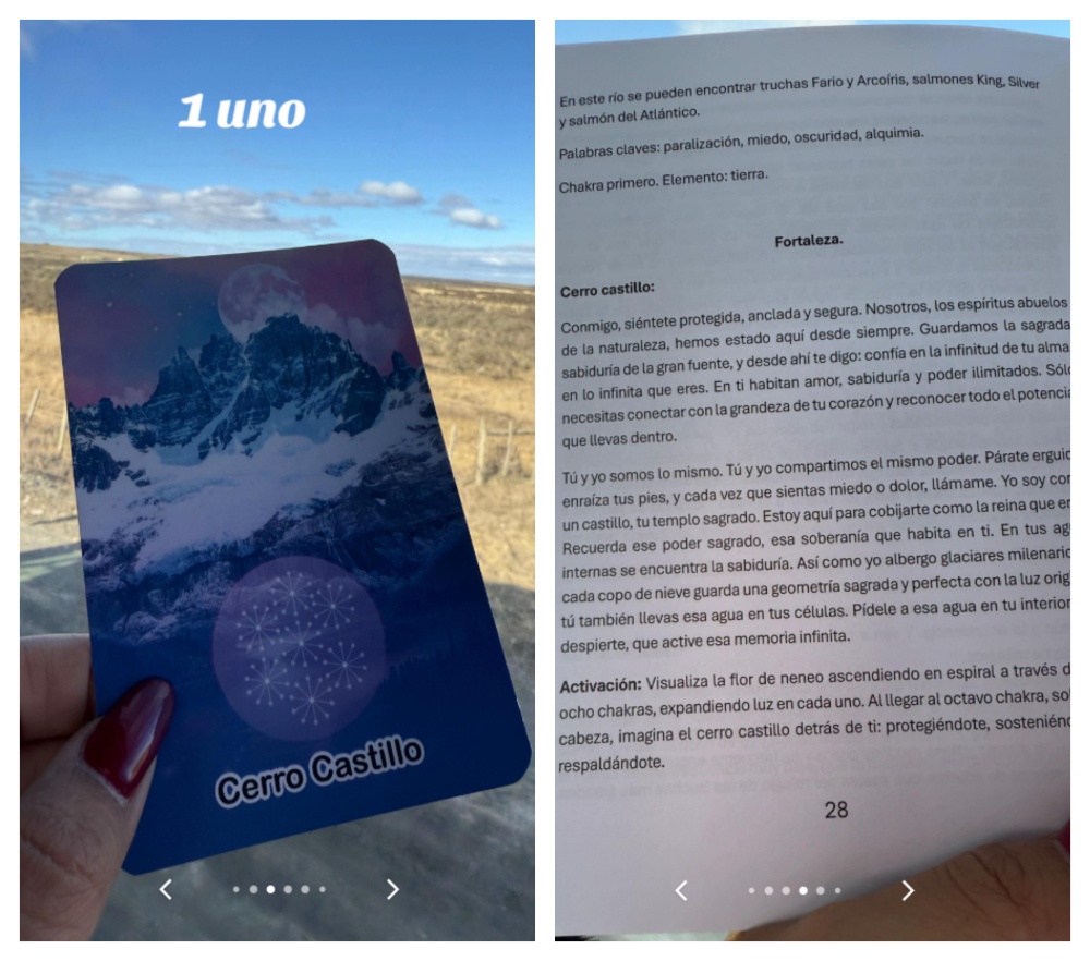 La primera carta muestra el Cerro Castillo y habla sobre la fortaleza: “Siéntete protegida, anclada y segura… Confía en la infinidad de tu alma, en lo infinita que eres. En ti habitan amor, sabiduría y poder ilimitados. Solo necesitas conectar con la grandeza de tu corazón”.