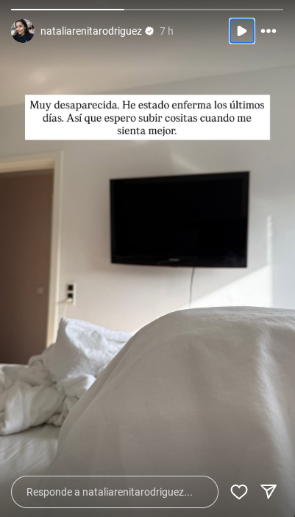 En sus historias de Instagram, la ex Yingo de 37 años compartió una foto en la que aparece recostada en su cama. “Muy desaparecida. He estado enferma los últimos días. Así que espero subir cositas cuando me sienta mejor”, contó.