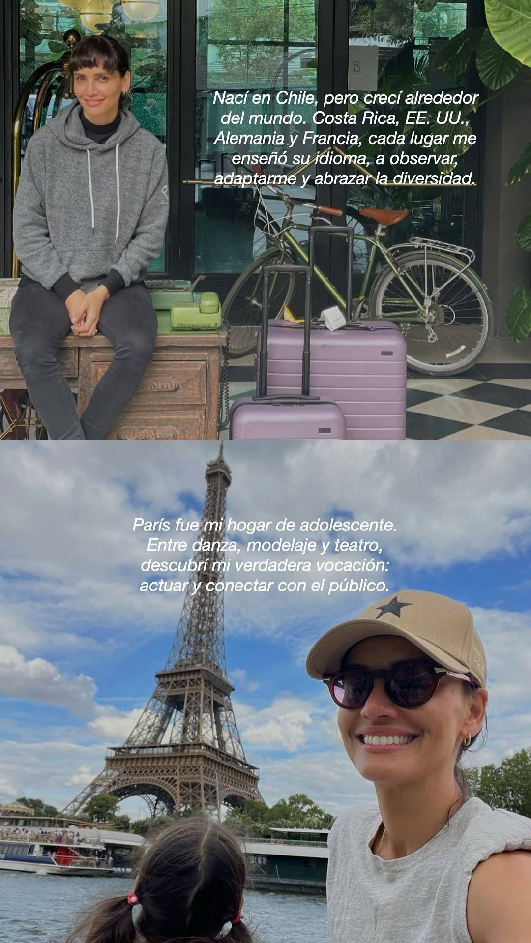 "París fue mi hogar de adolescente. Entre danza, modelaje y teatro, descubrí mi verdadera vocación: actuar y conectar con el público", se lee en una imagen en la que posa con su hija Luna ante la Torre Eiffel.