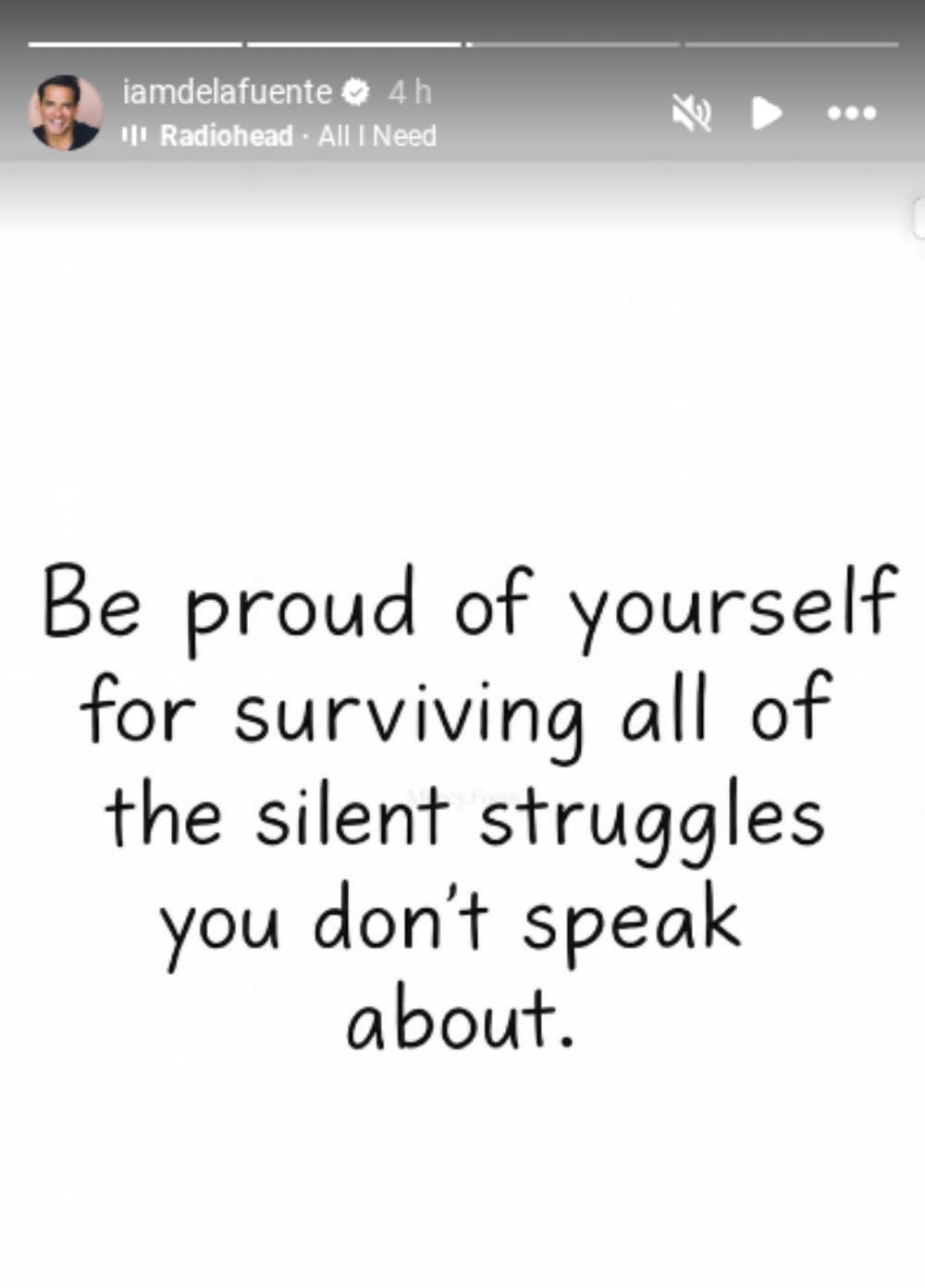 En sus historias de Instagram, el intérprete reposteó una imagen que reza: “Siéntete orgulloso de ti mismo, por sobrevivir a todas las luchas silenciosas de las que no hablas”.