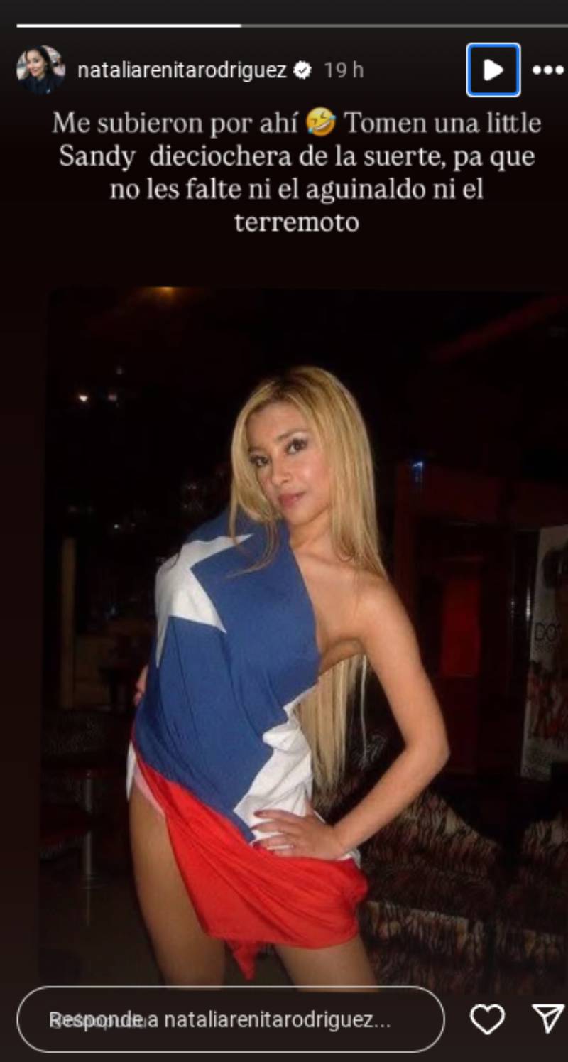 “Me subieron por ahí. Tomen una little Sandy (Arenita en inglés) dieciochera de la suerte, pa’ que no les falte ni el aguinaldo, ni el terremoto”, escribió con un toque de humor la ex chica reality.