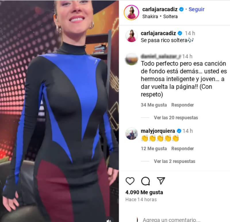 "Se pasa rico soltera", escribió Jara en una publicación de Instagram, en la que justamente suena el tema de la cantante colombiana. Sin dejar de sonreír, la conductora muestra su outfit, da un giro y lanza un beso.
