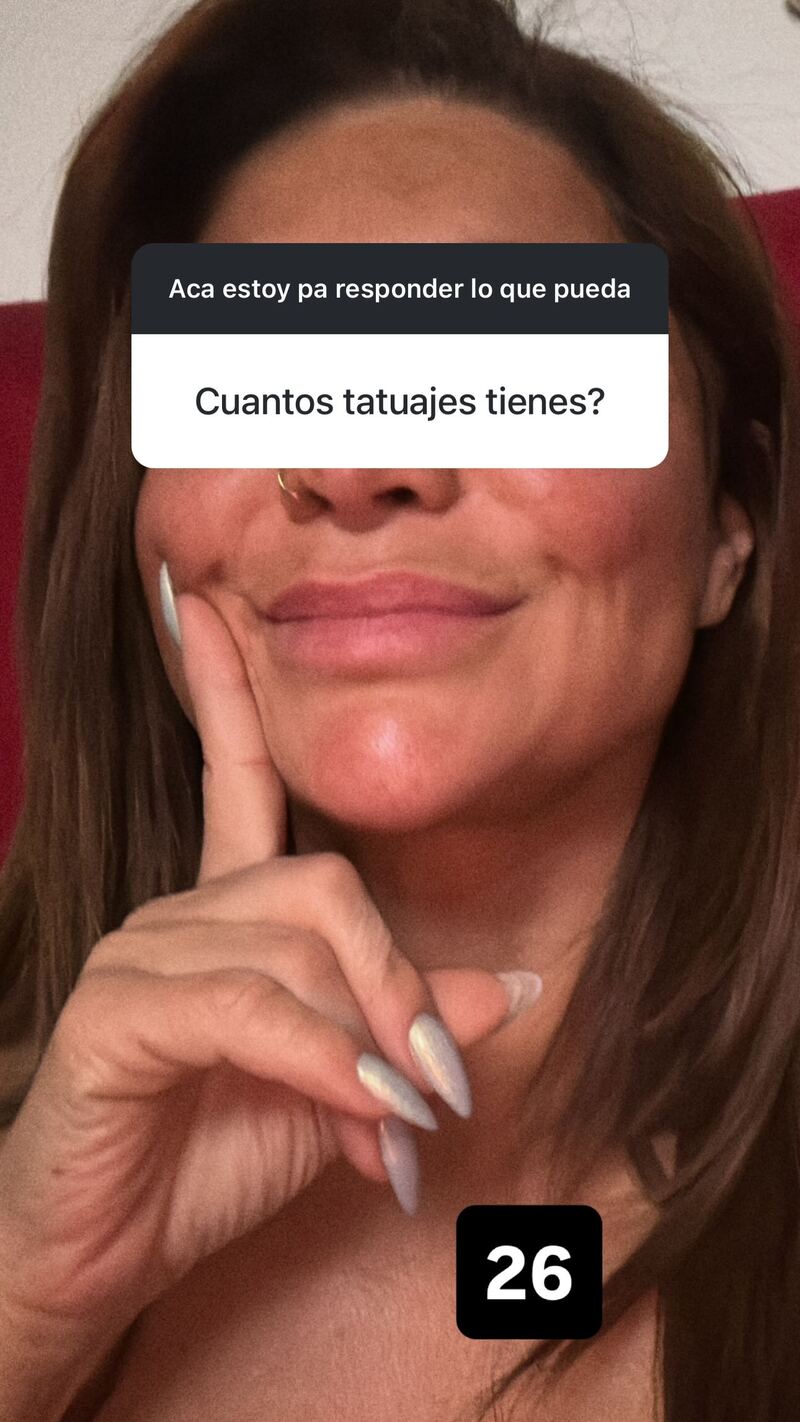 Con sus ojos tapados por la casilla de respuestas, sonrisa cerrada y su dedo índice sobre mejilla, Antonella reveló que en la actualidad tiene 26 tatuajes.