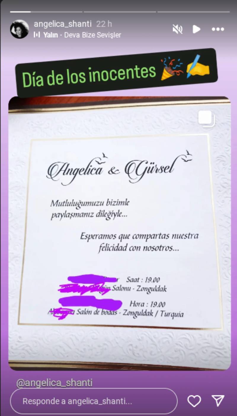 "Día de los inocentes", escribió Angélica sobre la imagen de la que parece una falsa tarjeta de invitación a su matrimonio en Turquía, que publicó en sus historias. La influencer aclaró luego que fue un amigo de su novio quien elaboró la broma.