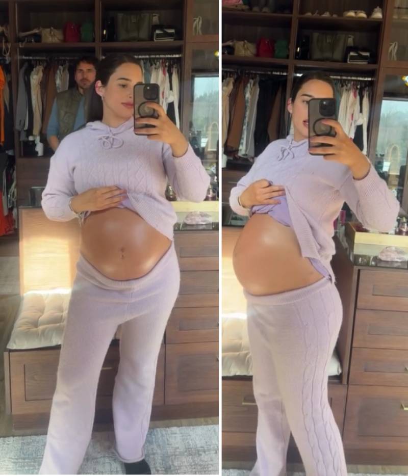“Así estamos con casi 35 semanas”, indicó Melina Noto en el video que grabó frente a un espejo, con Pangal observando desde el fondo. “No para de crecer”, agregó, en referencia al tamaño de su guatita.