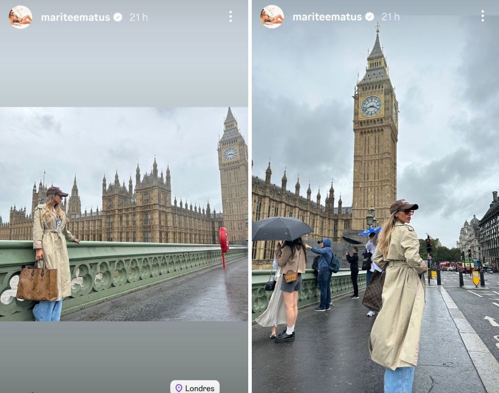 De pie sobre el puente de Westminster, que cruza el río Támesis, Marité Matus posó para una imponente postal que captó la grandeza de la fachada del parlamento británico, junto a su look casual chic con el que recorrió los sitios más emblemáticos de la ciudad.