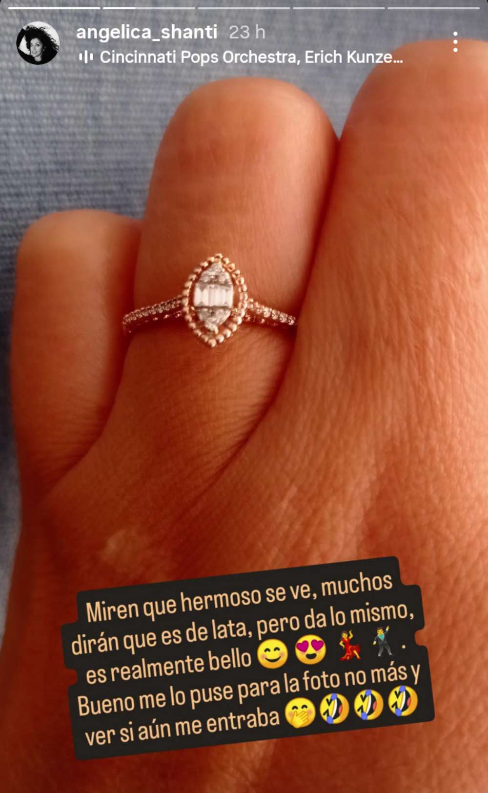 “Miren qué hermoso se ve, muchos dirán que es de lata, pero da lo mismo, realmente es bello. Me lo puse para la foto y ver si aún me entraba”, escribió días atrás en una historia de Instagram, en la que se aprecia la sortija en su dedo.