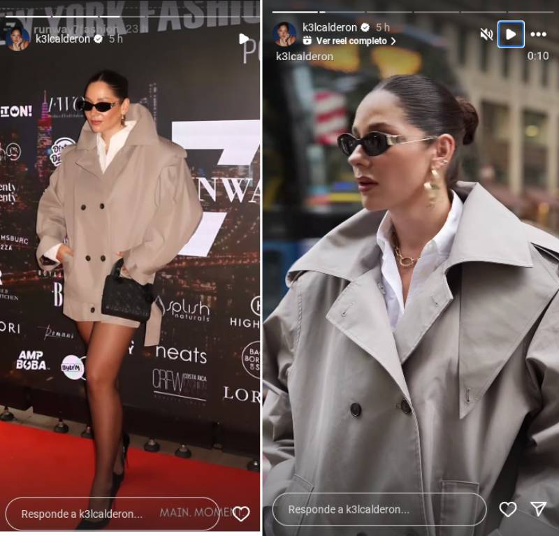 En sus historias de Instagram, Kel compartió las postales que detallan su look en la gran apertura de la semana de la moda, encabezado con una minichaqueta estilo trench coat de Helsa Studio sobre una camisa blanca básica.