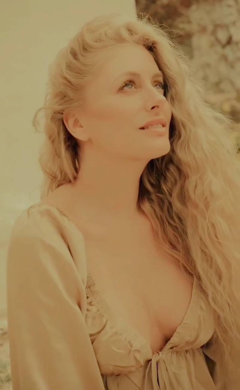 En su registro, Cata Palacios se mueve de forma orgánica frente a la cámara, mientras luce su pelo rubio en suaves ondas y porta un delicado vestido beige de escote princesa y mangas abullonadas.