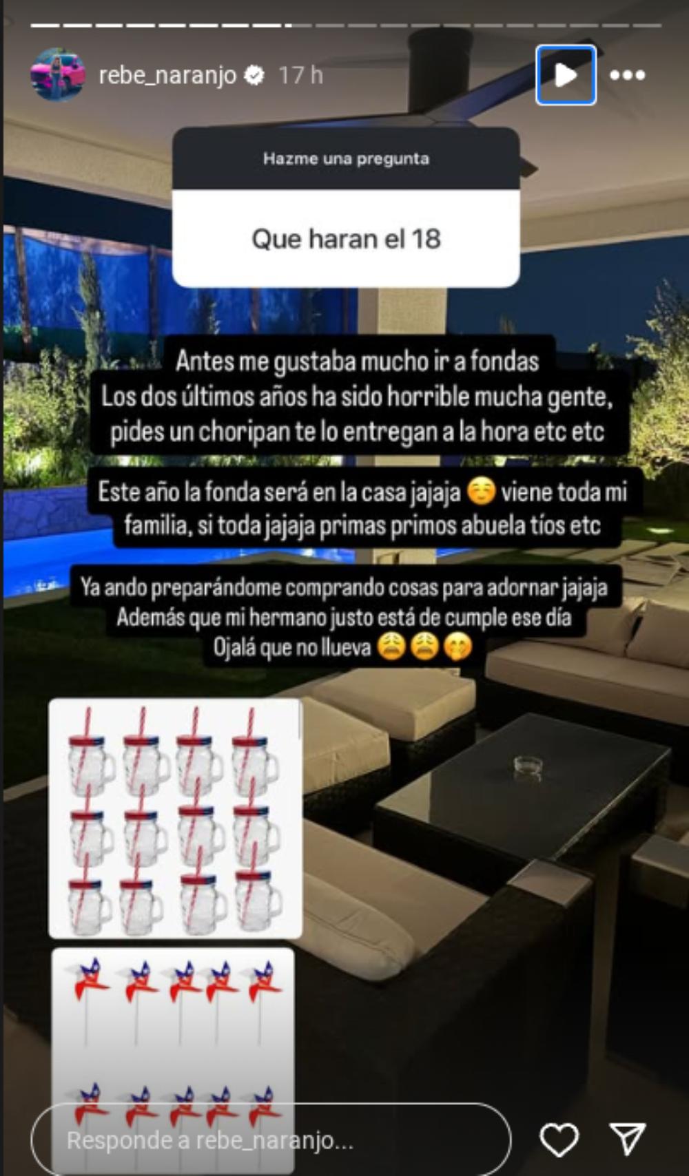 “Antes me gustaba mucho ir a fondas. Los dos últimos años ha sido horrible: mucha gente, pides un choripán y te lo entregan a la hora. Este año la fonda será en la casa, viene toda mi familia: primos, abuela, tíos, etc”; escribió Rebeca en Instagram.