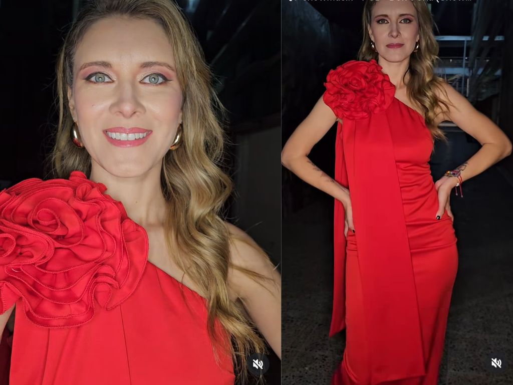 Carla Jara lleva el rojo escarlata en una versión minimalista con un detalle floral en 3D
