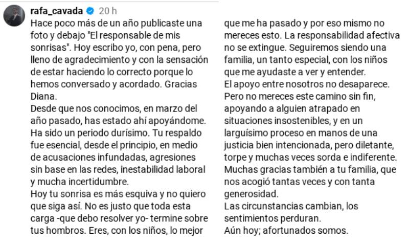 Rafael Cavada remarcó en su post que "los sentimientos perduran", y Diana dejó un comentario con el que confirma que quedaron en buenos términos. "Siempre familia, aguante", escribió.