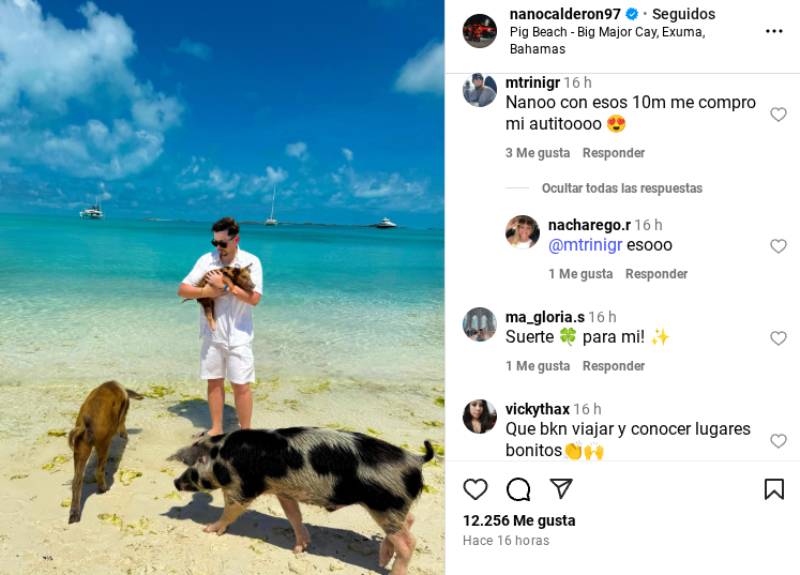 Hernán “Nano” Calderón compartió en redes sociales una foto que se tomó en la famosa Isla de los Cerdos, en Bahamas, donde aparece sosteniendo un pequeño chancho en una hermosa playa.
