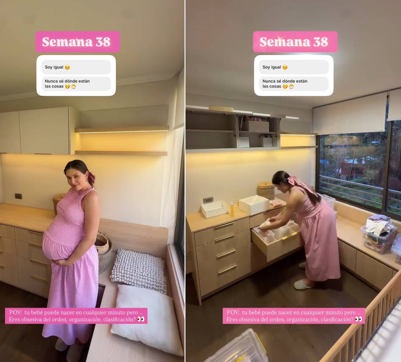 Posteriormente, subió un video en el que muestra con humor cómo guarda las pertenencias de su hija en su futura habitación: "POV: Tu bebé puede nacer en cualquier minuto, pero... ¿Eres obsesiva del orden, organización, clasificación?".
