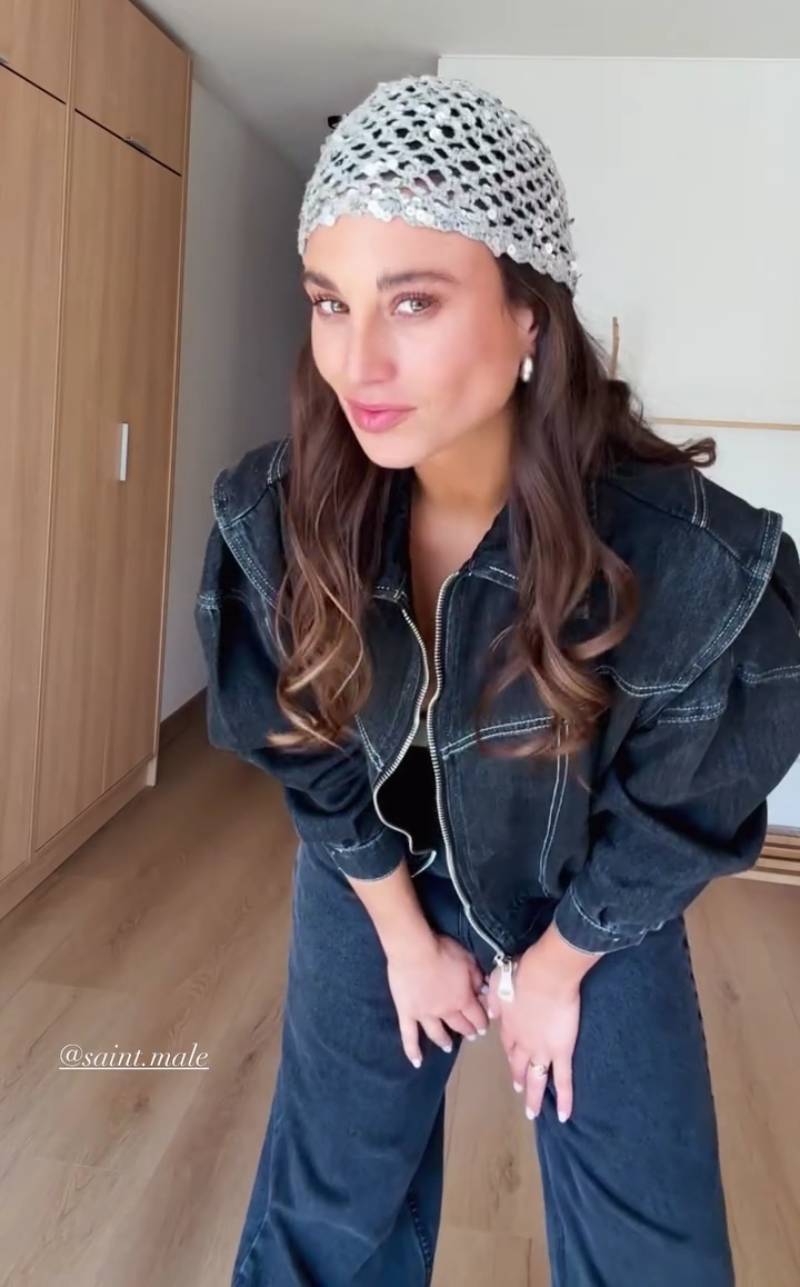 Tita Ureta luce el gorro de crochet con lentejuelas que es tendencia retro y lo combina con la moda denim